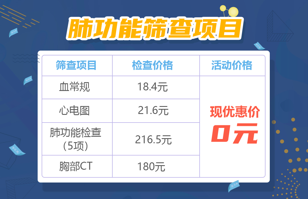 凡到院患者,享“0”元肺功能筛查(原价436.5元),(检查项目包含:1.胸部CT;2.肺功能检查;3.血常规;4.心电图)